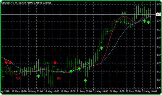 We use a front-weighted moving average for the slow indicator. The fast indicator emulates variable length weighted moving average—shorter in trends, longer in sideways markets.