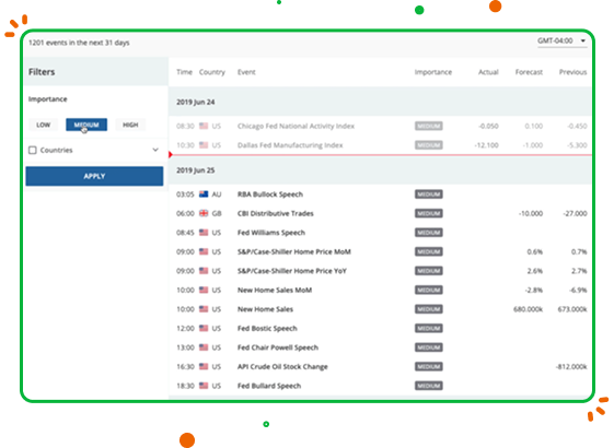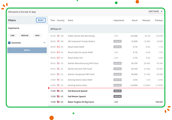 Here you’ll find current and upcoming economic events listed in chronological order with a red line marking the current time. We’ll automatically detect your local time zone, but you can always switch this at the top if needed!