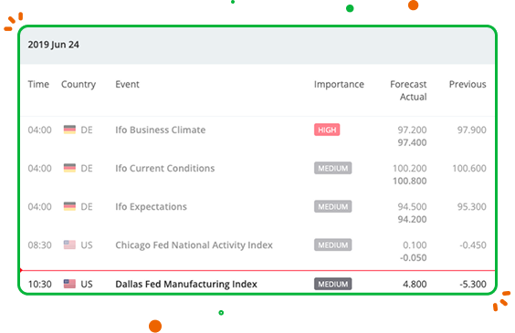 Looking at the calendar, you’ll find all the most recent information available (updated in real-time!) for each economic event including: The event title, the time it will occur, the country it takes place in, its expected impact on currencies, the forecasted values and the actual value, revision & previous value.